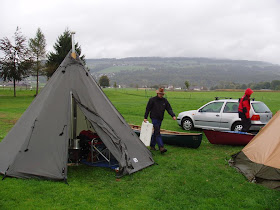 Nach mehreren Stunden auf den paar Flusskilometern und manchem auch heftigeren Regenschauer kamen wir zurück zum Zeltplatz, holten Heinz’ Auto mit den Einkäufen, duschten und machten uns mit Heinz’ Equipment ans Kochen – präziser: Heinz kochte und wir beschränkten uns auf Hilfsdienste. Dann aßen wir ein vortreffliches Mahl aus Kalbsgeschnetzeltem in Sahnesoße mit Pilzen und Spätzle gemeinsam in Joachims und Ruths großem Zelt während sich die immer kältere Nacht und Nebel über das Tal senkten.